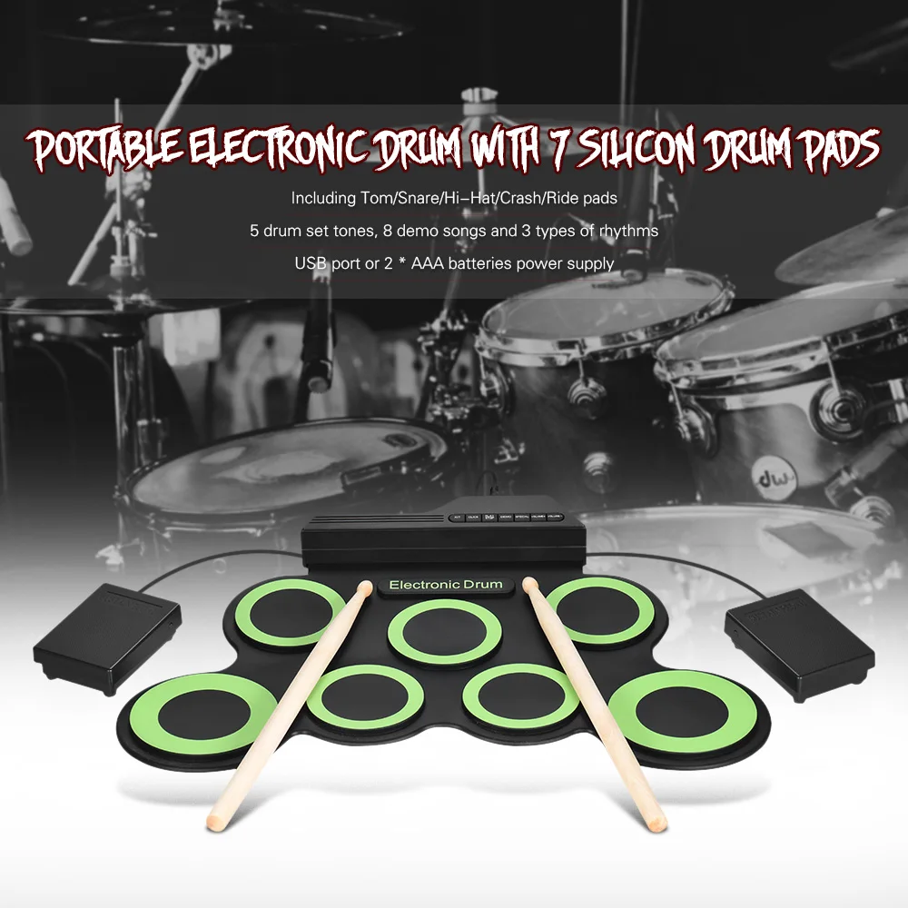 Electronic Drum Compact Portable Digital Electronic Roll Up Drum Kit 7 Silicon Drum Pads USB Powere