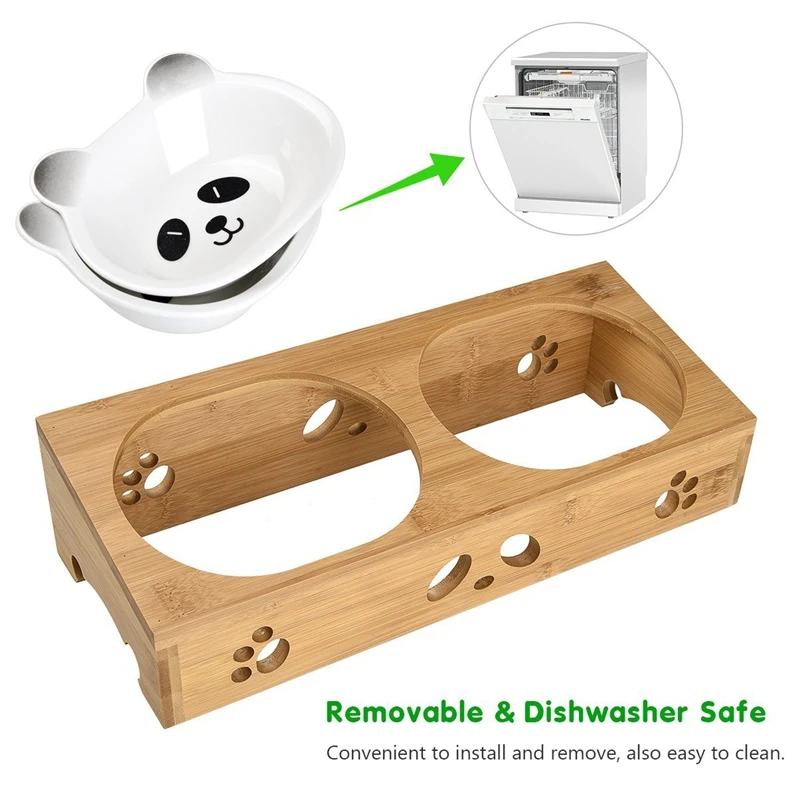 HIGH QUALITY Elevated Dog Cat Bowls Raised Pet Feeder Solid Bamboo Stand Ceramic Double Pet BowlSuitable For Cat